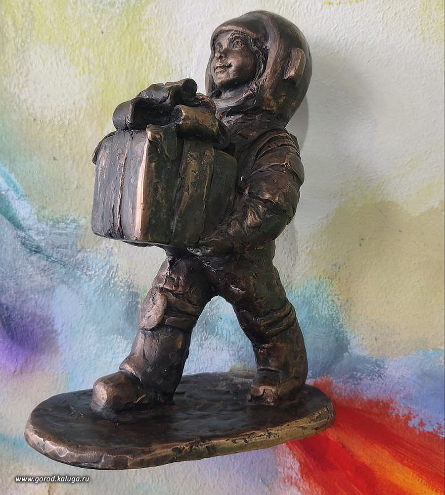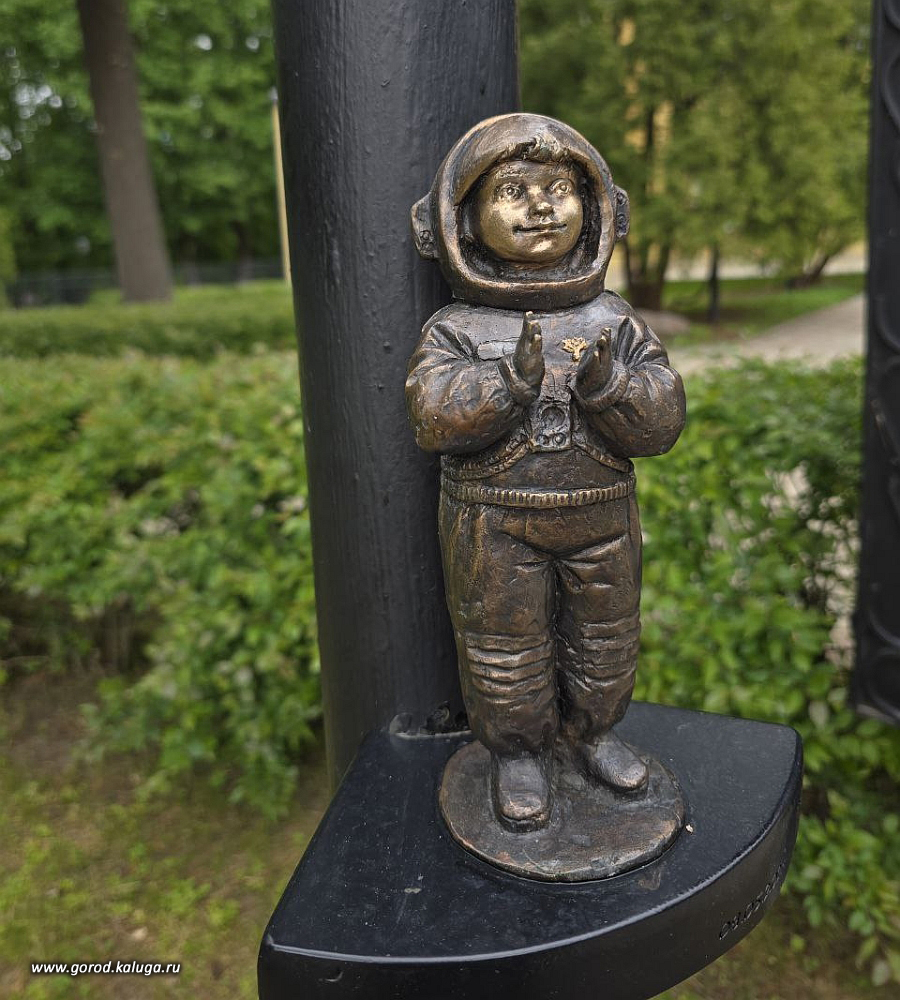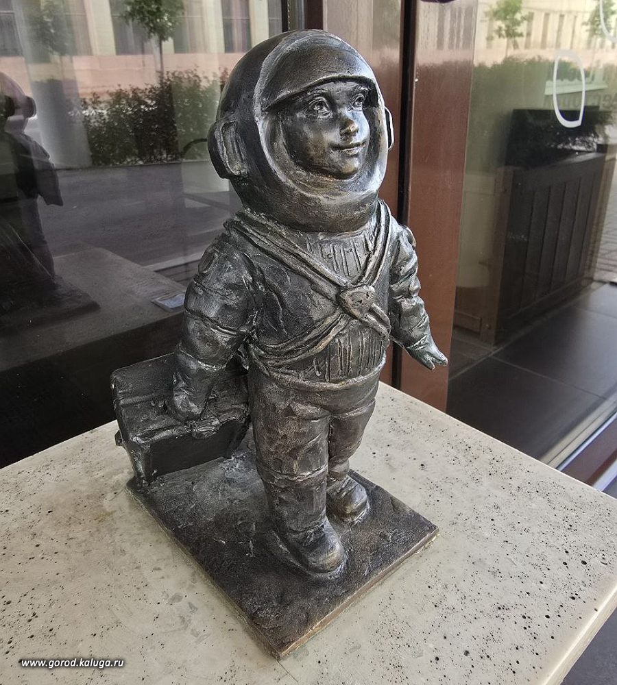 В июне 2023 года в Калуге открыли бронзовую скульптуру маленького космонавта. Этот космонавт наблюдает за происходящим с порожка Драматического Театра. Он сидит в скафандре, сняв шлем, и смотрит в небо. Высота космонавта — 20 сантиметров, вес — чуть больше двух килограммов. |